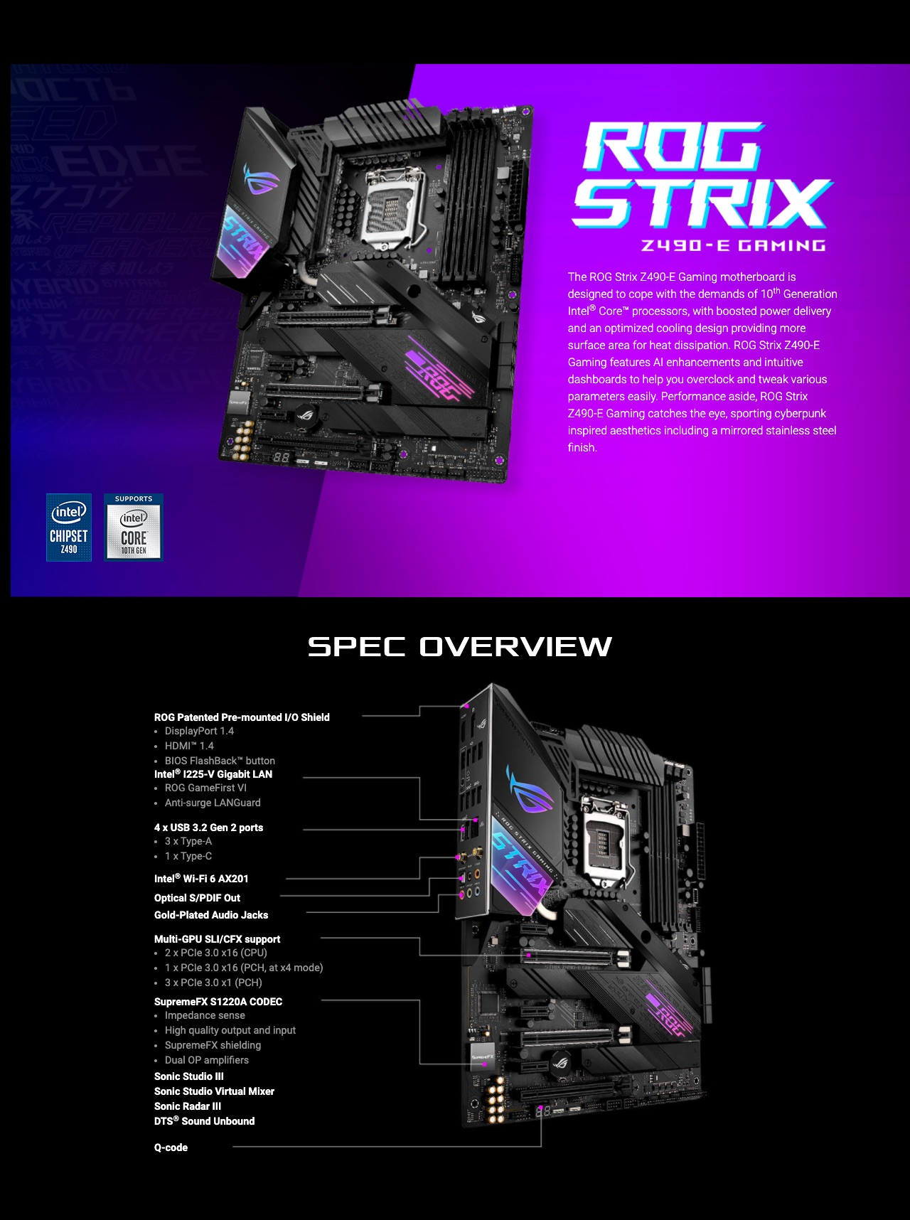 Intel® Z490 LGA 1200 ATX gaming motherboard featuring 16 power stages, AI Overclocking, AI Cooling, AI Networking, WiFi 6 (802.11ax), Intel® 2.5 Gb Ethernet, dual M.2 with heatsinks, USB 3.2 Gen 2, SATA and AURA Sync RGB lighting